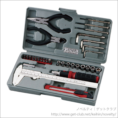 内容:ラチェット式ビットドライバー、エクステンションバー、ビットアダプター、カッター、ノギス、ラジオペンチ、ニッパー各1個、ソケット・ビット各9個、精密ドライバー3個、6角レンチ4個