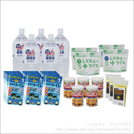 ・5年安心保存水2L×5本・カンパン100g×5個・レスキューライス(白米)×2個・レスキューライス(おかゆ)×2個・リバーシブルアルミブランケット×3個・携帯用トイレ1P×15個