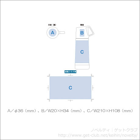 容量:350ml 取説付(紙箱面)、食品衛生検査済 シルクレイアウト可能範囲/A/φ36(mm)、B/W20×H34(mm)、C/W210×H108(mm)印刷範囲/C/W200×H108(mm)※パッド印刷、回転シルク印刷は別途御見積 |