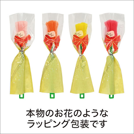 一輪ずつ、プレゼントのようにかわいくラッピング、色はピンク・オレンジ・イエロー・レッドと華やかです。