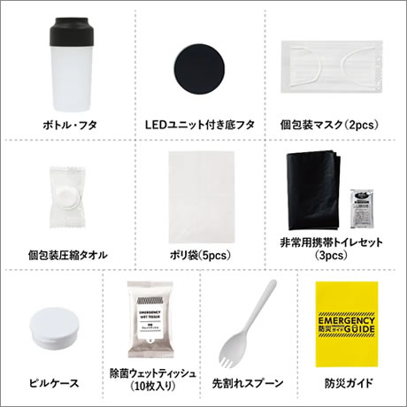 | 本体サイズ | ボトル/φ85×215(mm)、マスク/約165×95(mm)、圧縮タオル/広げた時:約200×200(mm)、ウェットティッシュ/92×144(mm)、凝固剤/50×83(mm)、携帯トイレ付属ごみ袋/650×500(mm)、スプーン30×140(mm)、ピルケース/φ53×20(mm)、ポリ袋/80×270(mm)、防災ガイド/70×105(mm) |