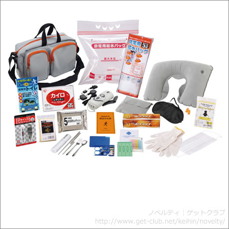 セット内容:収納ショルダーバッグ、アルミブランケット、レインコート、IDホイッスルカラビナリング、携帯用トイレ1P、防災用ウエットティッシュ、綿棒&絆創膏、軍手、ダイナモマルチライト、防災の心得、携帯カトラリー、ソーイングセット、ポリラップ、安眠3点セット、給水袋3L、マスク、使い捨てカイロ ※セット商品の色柄は写真と異なる場合があります。 名入れ箇所:バッグポケット中央30×60mm以内シルク印刷 |