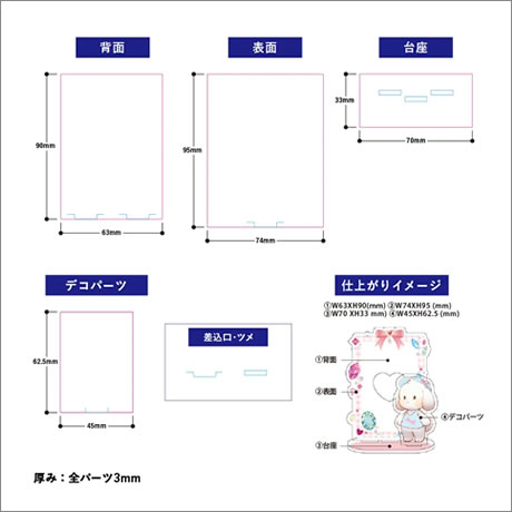 | 本体サイズ | 背面/63×90×3(mm) 表面/74×95×3(mm) 台座/70×33×3(mm) デコパーツ/45×62.5×3 ((mm) |