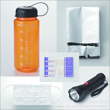 ■セット内容:ウォーターボトル(満水容量690ml)、懐中電灯、防寒用アルミシート、マスク、救急絆創膏2枚