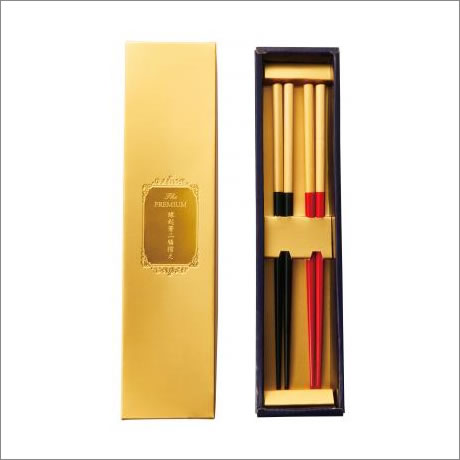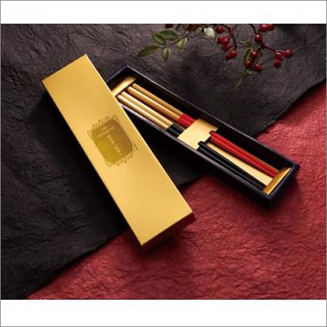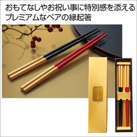 箔押しが施された金色の化粧箱に設えたあでやかな夫婦箸はインパクトも抜群。慶事のギフトに最適です。