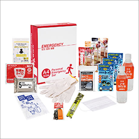 バランススティック×3・7年保存水×2・携帯用トイレ1P×3・静音アルミブランケット・防災用ウェットティッシュ・軍手・発光スティック・カイロ・フラットホイッスル・マスク・レインコート・防災てぬぐい