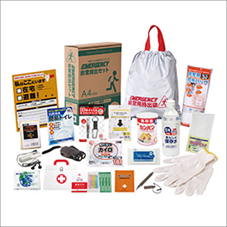 非常持出袋・防災の心得・IDホイッスル&カラビナリング・カイロ・レインコート・抗菌消臭簡易トイレ・ダイナモLEDライト・FMラジオ・軍手・アルミブランケット・マスク・除菌アルコールウェットティッシュ・2WAYタッチペン・5年保存水500ml・給水袋3L・緊急避難カード・水に流せるペーパー・救急4点セット・カンパン