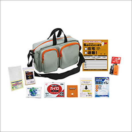 収納ショルダーバッグ・防災の心得・ホイッスル・カイロ・レインコート・抗菌消臭簡易トイレ1P・アルミブランケット・マスク・緊急避難カード・水に流せるペーパー
