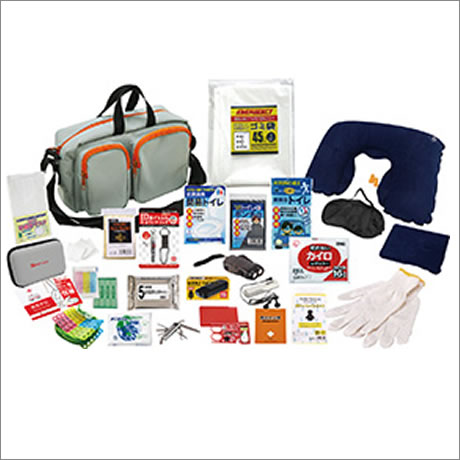 収納ショルダーバッグ・防災の心得・IDホイッスル&カラビナリング・カイロ・レインコート・携帯用トイレ1P・抗菌消臭簡易トイレ1P・トイレポンチョ・ダイナモLEDライト・モバイルバッテリー(乾電池式)・FMラジオ・軍手・アルミブランケット・マスク・ウェットティッシュ・洗濯ロープ&ピンチ・ネックピロー・アイマスク・耳栓・8徳ナイフ・ソーイングセット・水に流せるペーパー・救急6点セット・45Lゴミ袋3P