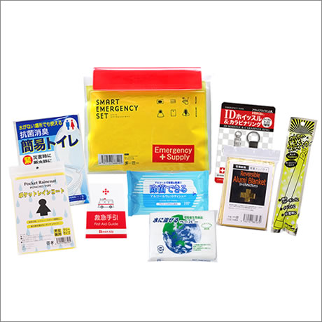 防水ケース・IDホイッスル&カラビナリング・レインコート・除菌アルコールウェットティッシュ・抗菌消臭トイレ・リバーシブルアルミブランケット・水に流せるペーパー・かんたん発光スティック・救急手引き