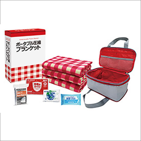 圧縮収納バッグ・フリースブランケット×3・カイロ・静音アルミブランケット・除菌アルコールウェットティッシュ・水に流せるペーパー