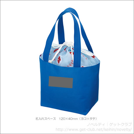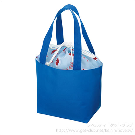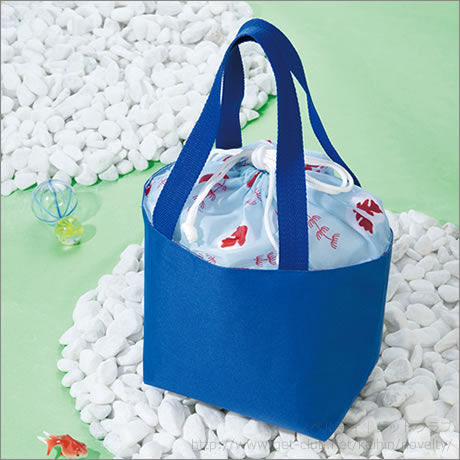 上部分が巾着タイプになっており、まるで、金魚鉢に金魚が泳いでいるような、かわいらしいバッグです。ランチバッグとしてお弁当を入れられる涼しげなバッグです。