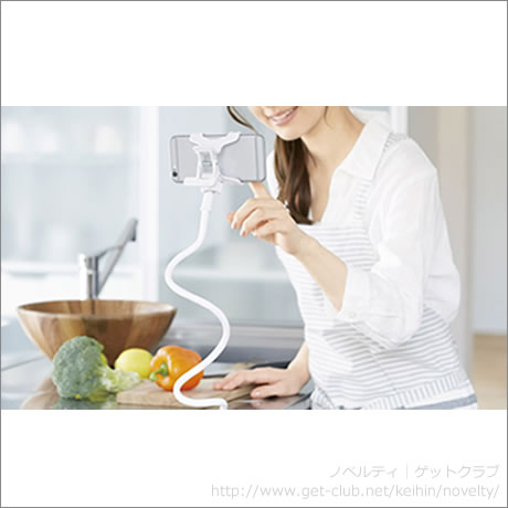 最長73cmまで伸ばせるスマホホルダーは、キッチンやデスク、ベッドサイドでクリップで固定して使用できます。