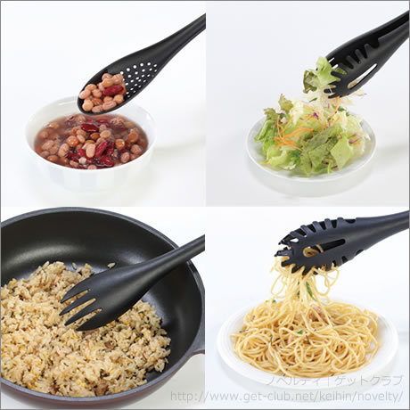 異なるツールが5種類、お料理に合わせて付け替えられます。トングの先がテーブルにつかないグリップ形状が衛生的。
