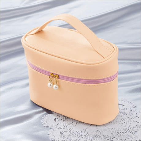 本体にはレザーのような高級感あふれる生地を、ファスナーには上品なパールチャームを採用しました。蓋部分にも高さがあるので、立てたまま保管しておきたいボトルもそのまま入れられます。ヘアクリップなどの収納に便利な内ポケット付き。スイートな艶めき、できました。