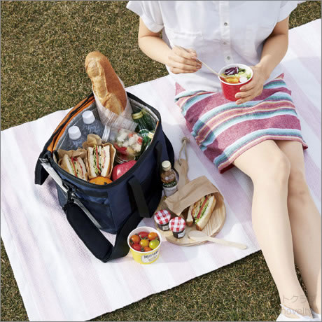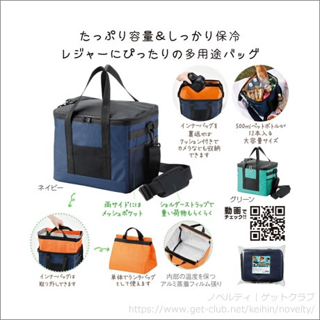 500mlペットボトルが12本も入る大容量サイズで、たっぷり!しっかり保冷が出来るようにインナーバッグ式になっています。取り外し可能。クッションつきのため、カメラなども収納できます。長さ調節のできるショルダーストラップに、バッグの両サイドには目朱ポケットもあり、機能も使い勝手も充実レジャーバッグです。