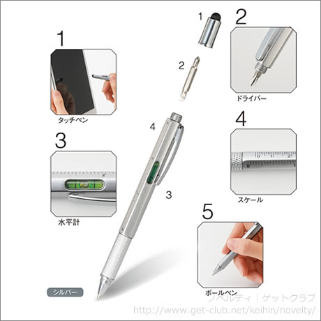 ボールペンだけでなく、スケール・タッチペン・水平計・ドライバーと5つの機能を持つペンです。1本もっていれば、さまざまなシーンで活躍すること間違いありません。さまざまな機能を持ち合わせた便利なボールペン
