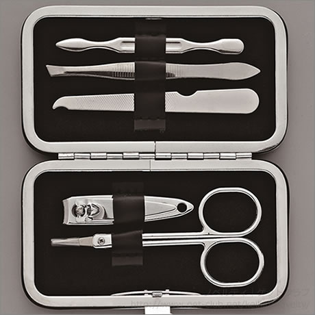 身だしなみを整える爪切り、爪やすり、ハサミ、甘皮切り、毛抜きのグルーミングツール5点セット。シンプル&コンパクトなケースにセットされています。