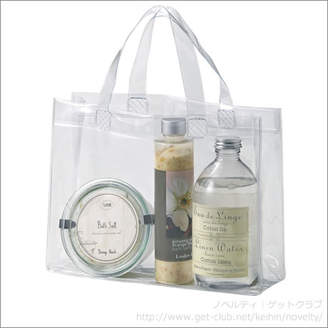 展示会の資料配布や化粧品・雑貨類のセット販売用ギフトバッグとしてもご使用いただきやすい透明なトートバッグです。