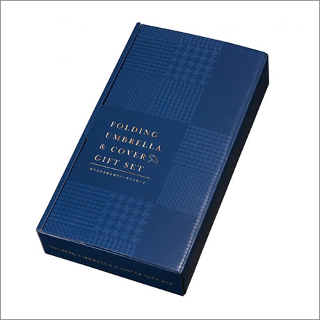 トラッドなチェック柄の透かしが入った折りたたみ傘と、ネイビーでシンプルなデザインが使いやすい傘カバーのギフトセットです。ブック型のパッケージで上質感があります。