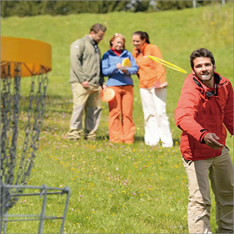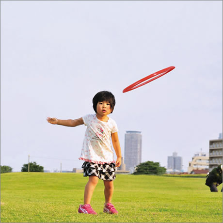 ドーナツ状のフライングディスクで大人も子供も 一緒に遊ぼう。