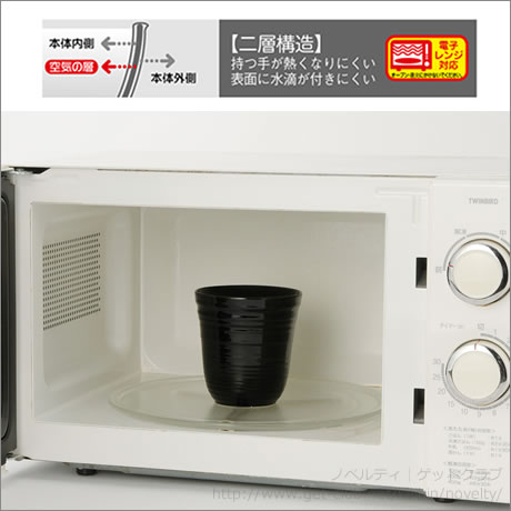 陶器の間に空気の層を挟んであるので快適な使い心地。電子レンジOKです。熱いものを入れてもすぐ持てて、冷たいものを入れても水滴がつきにくい。