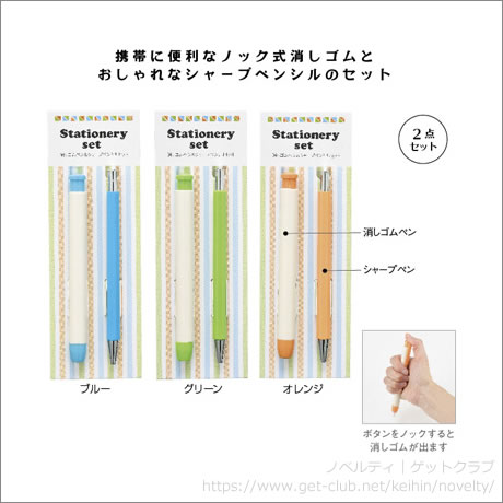 ボタンをノックすると消しゴムが出てくるペン型ノック式消しゴムと、シャーベットカラーのシャープペンのセット。