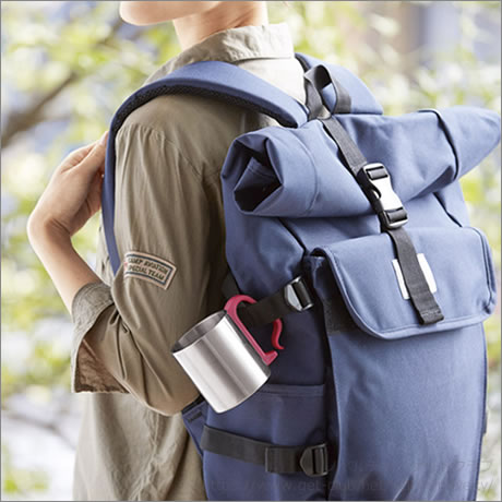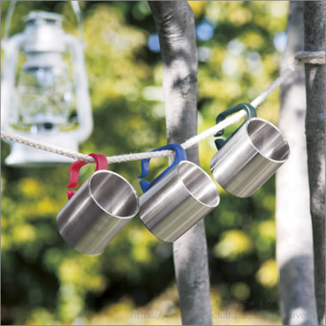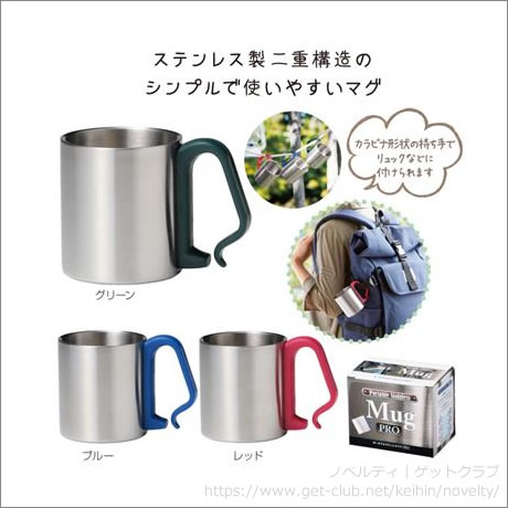 二重構造のステンレイス製。シンプルで瑠買いやすいマグは、カラビナ形状の持ち手で、リュックなどに引っ掛けておけます。