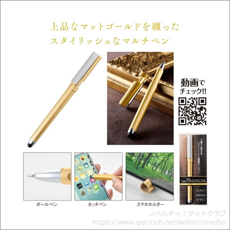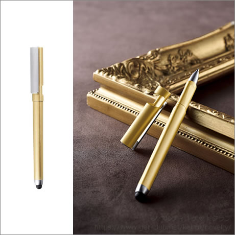 上品なマットゴールドカラーのボディに、機能が3つ。黒色インクのボールペン、モバイルようのタッチペン、そしてキャップはスマホホルダーとして使えます。