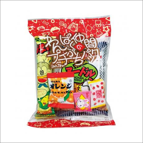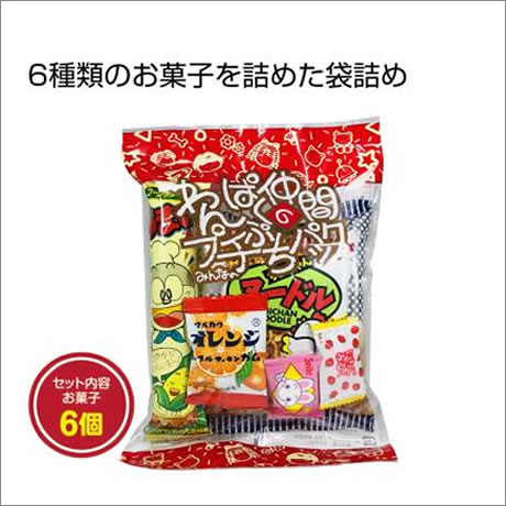 袋詰め内容:ちーずあられ・ちびちゃんヌードル・うまい棒コーンポタージュ味・スマイル動物ラムネ・いちごみるく・マーブルグレープガム各1個