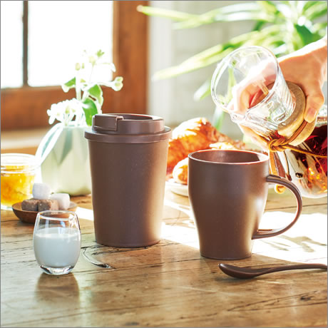 使い勝手のいいスプーン付きが嬉しいマグカップ。落ち着いたブラウンカラーはどんな場面にも馴染みます。