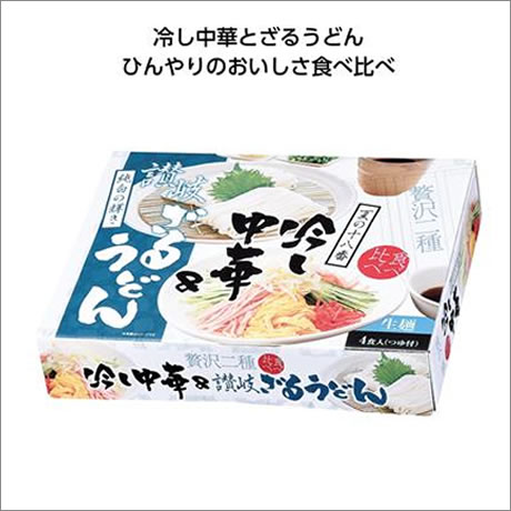 ざるうどんには天ぷらを添えたり、冷やし中華は王道の具材やまぜそば風にしたりなど、たっぷり4食(各2)楽しめる食べ比べセットです。