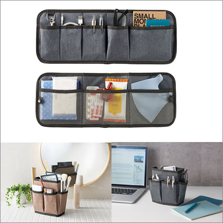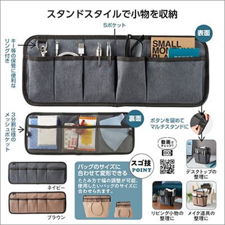 ボタンを留めてマルチスタンドにしたり、バッグの整理ポケットにしたり、リビングやメイク道具の整理に便利。