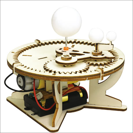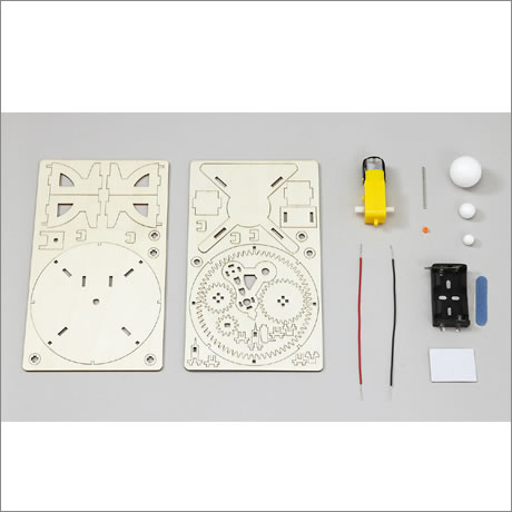 パーツ板A×1、パーツ板B×1、モーター×1、軸×1、スペーサー×1、導線(赤)×1、導線(黒)×1、電池ボックス×1、発泡スチロール球大・中・小×各1、両面テープ×1、やすり×1