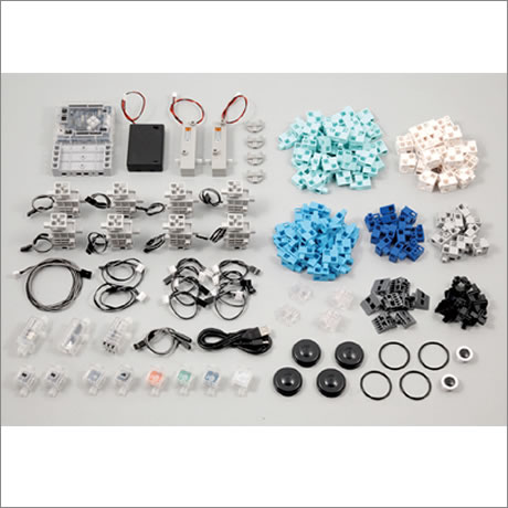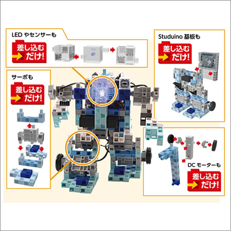 サーボモーター x 8, ロボット用DCモーター x 2, スタディーノ カバー台座付 x 1, 電池ボックス x 1, ロボット用LED (青, 赤, 白, 緑) x 各1, ロボット用電子ブザー x 1, ロボット用加速度センサー x 1, ロボット用音センサー x 1, ロボット用タッチセンサー x 1, ロボット用光センサー x 1, ロボット用赤外線フォトリフレクタ x 1, センサー接続コード (3芯15 cm) x 8, センサー接続コード (3芯30 cm) x 2, センサー接続コード (4芯50 cm) x 1, USBケーブル mini-B (80 cm) x 1, 基本四角: クリア x 2, 白 x 20, 三角A: クリア x 2, グレー x 8, ハーフA: 薄グレー x 11, ハーフB: 青 x 12, ハーフC: 薄水 x 54, ハーフD: 水 x 30, 丸 x 2, 回転軸C x 8, タイヤ x 4, タイヤゴム x 4, ブロックリムーバー x 1