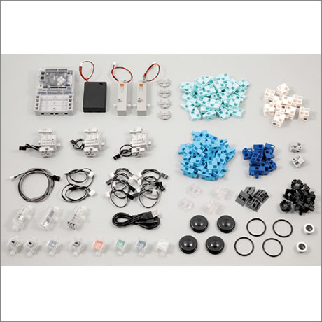 サーボモーター x 3, ロボット用DCモーター x 2, スタディーノ カバー台座付 x 1, 電池ボックス x 1, ロボット用LED (青, 赤, 白, 緑) x 各1, ロボット用電子ブザー x 1, ロボット用加速度センサー x 1, ロボット用音センサー x 1, ロボット用タッチセンサー x 1, ロボット用光センサー x 1, ロボット用赤外線フォトリフレクタ x 1, センサー接続コード (3芯15 cm) x 8, センサー接続コード (3芯30 cm) x 2, センサー接続コード (4芯50 cm) x 1, USBケーブル mini-B (80 cm) x 1, 基本四角: クリア x 2, 白 x 10, 三角A: クリア x 2, グレー x 4, ハーフA: 薄グレー x 2, ハーフB: 青 x 10, ハーフC: 薄水 x 40, ハーフD: 水 x 30, 丸 x 2, 回転軸C x 8, タイヤ x 4, タイヤゴム x 4, ブロックリムーバー x 1
