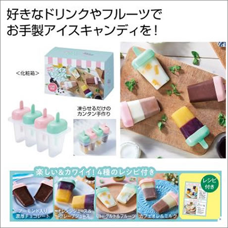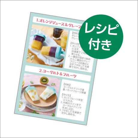 親子で楽しめる4種類のレシピ付きです(オレンジジュース&グレープジュース/ヨーグルト&フルーツ/カフェオレ&ミルク/アーモンド入り濃厚チョコレート)。