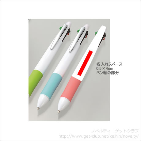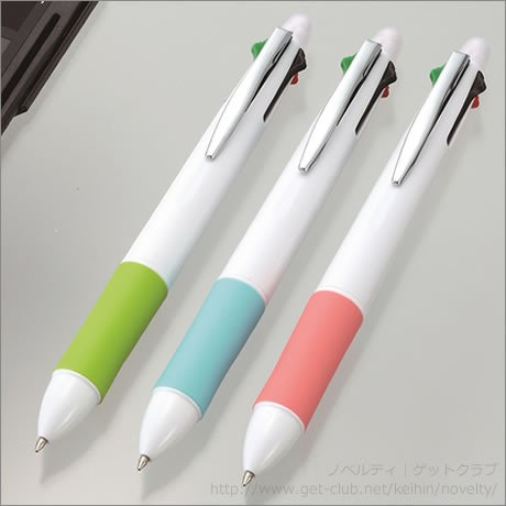 カラフルなボディに赤、黒、青、緑のインクのボールペンと、シャープペン、消しゴムがついています。