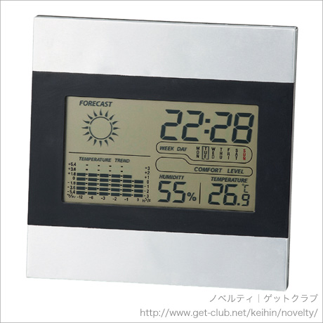 大きなデジタル画面表示で見やすい多機能時計。天気、気温、湿度、時間、アラーム機能付き。