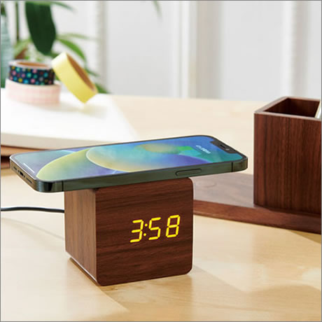 qi対応のスマートフォンを置くだけで充電できるワイヤレス充電機能付クロック。