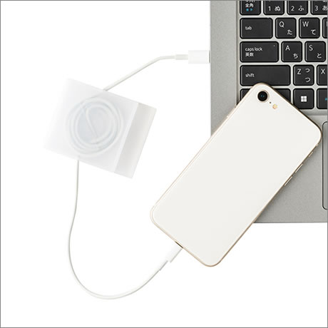 絡まりがちな充電用のコードを簡単にまとめられるアイテムです。本体にコードをセットしつまみを回すだけでコードを巻き取ることができ、きれいに収納できます!スマホスタンドも付いているので動画を楽しみながら充電ができます。販促用のノベルティとして人気なアイテムです。