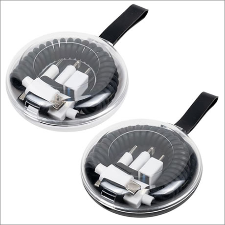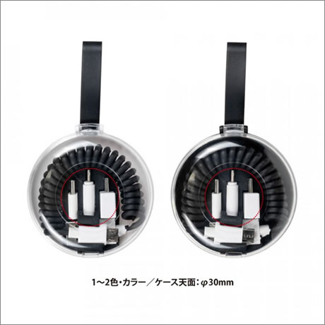 コンパクトなケースに収納されたスマートフォン用充電ケーブル。