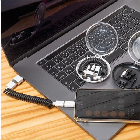 伸縮性のあるコイル状ケーブルは、使用時は伸ばして快適に、収納時はコンパクトにまとめることができ、丸型ケースにすっきり収納できます。