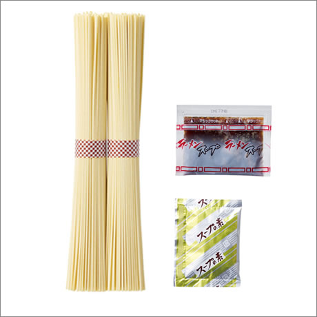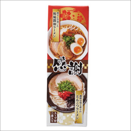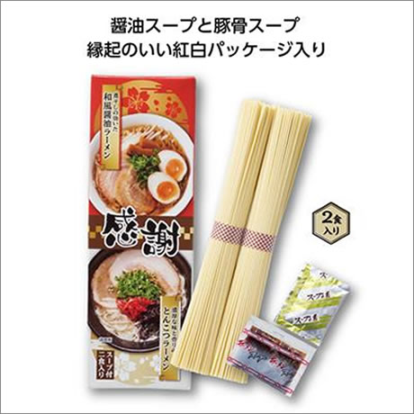醤油スープと豚骨スープの2食が楽しめる、縁起のよい紅白パッケージ入りの棒タイプラーメンです。