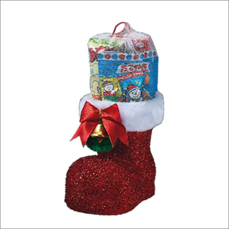 クリスマスプレゼントにぴったりなキラキララメ入りブーツにお菓子が入っています。
