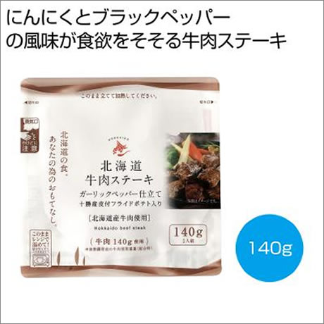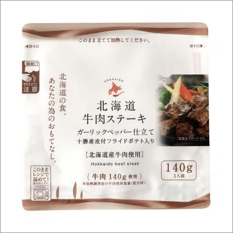レンジに袋のまま入れて温めるだけ。北海道産牛肉と十勝産皮つきフライドポテトが入っています。
