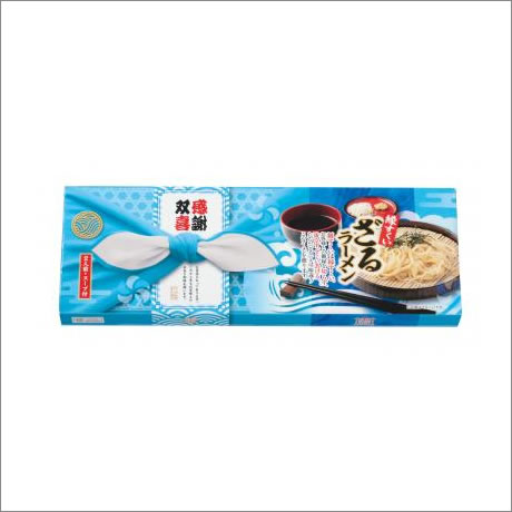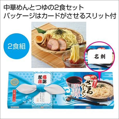 コンパクトで日持ちのする乾麺タイプのざるラーメン。名刺などのカードを差し込めるパッケージです。
