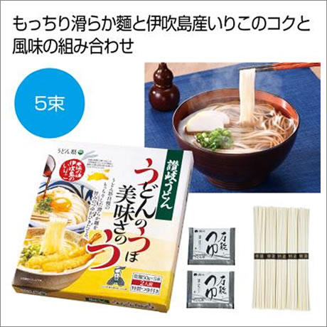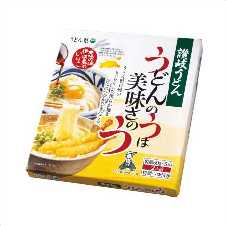 うどん県観光課係長「うどん健」入りのパッケージに、もっちりなめらか麺と伊吹島産いりこのコクと風味が自慢のつゆをセットしました。
