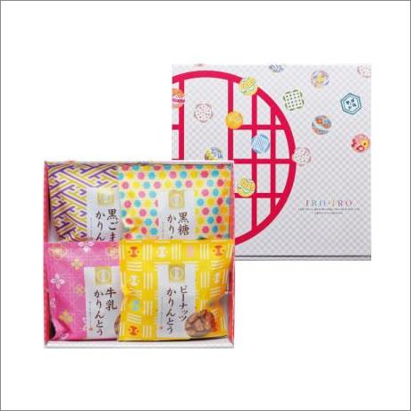 4種の味わいを楽しめる、かわいいパッケージのかりんとうの詰め合わせです。