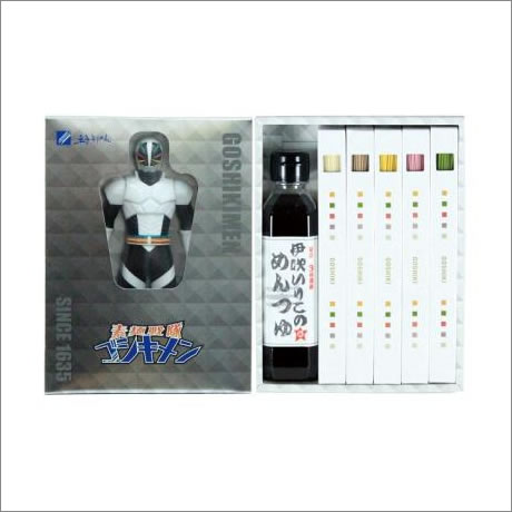 「素麺戦隊ゴシキメン」フィギュア、「手延五色そうめん」、「手延五色そうめん色束別」、「伊吹いりこのめんつゆ」をセットにしました!